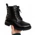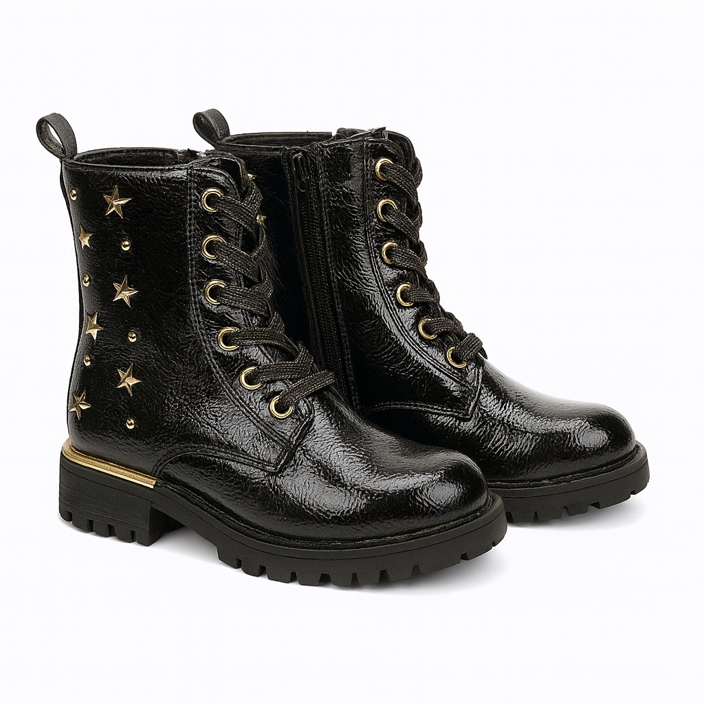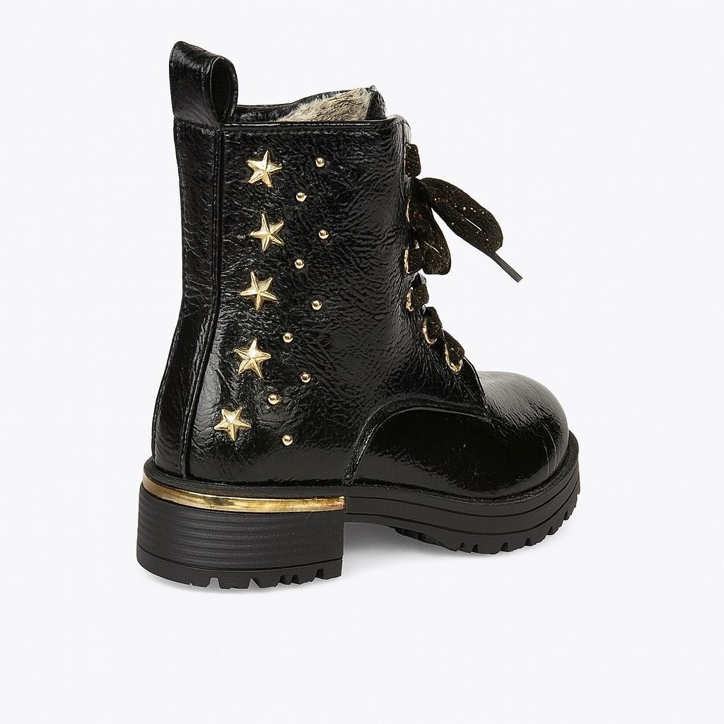 Bottine montante en cuir verni noir, ornée de clous et œillets dorés, avec lacets et semelle crantée pour un style à la fois chic et robuste.