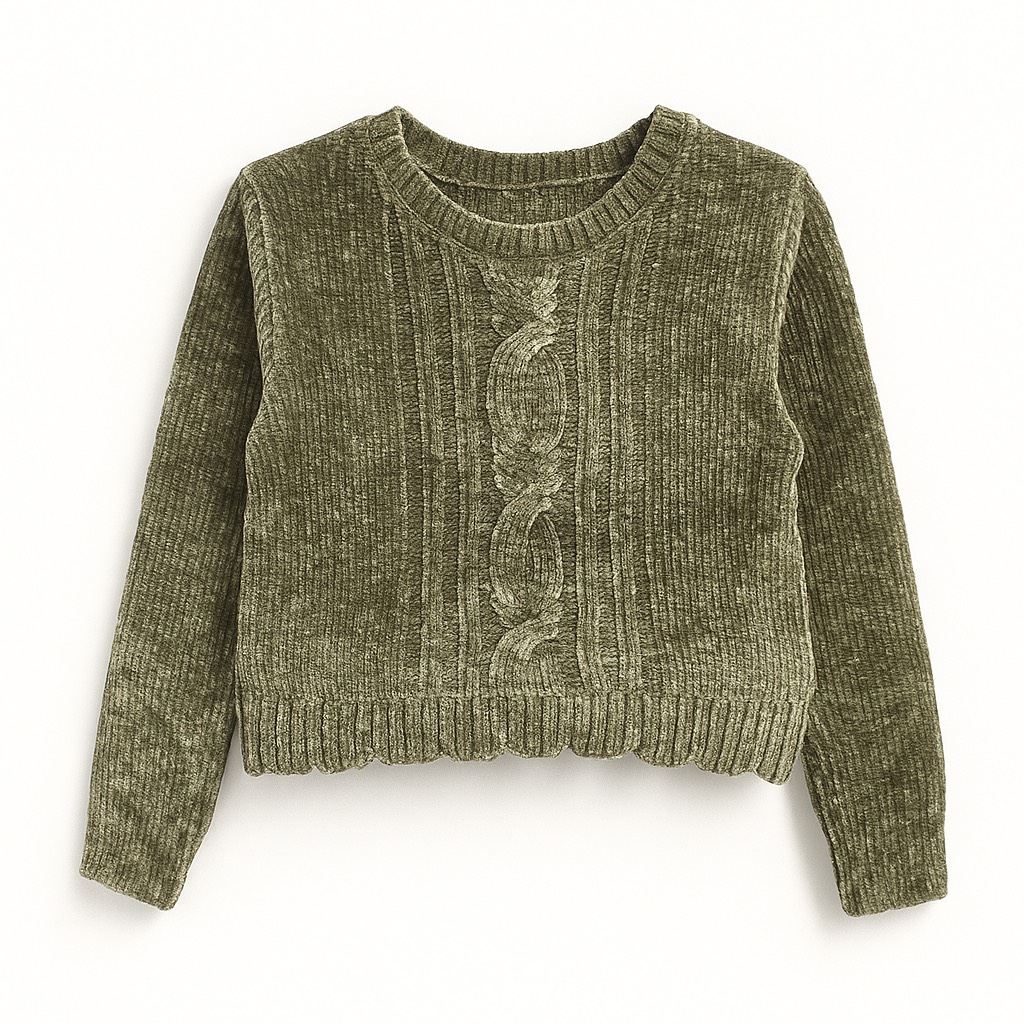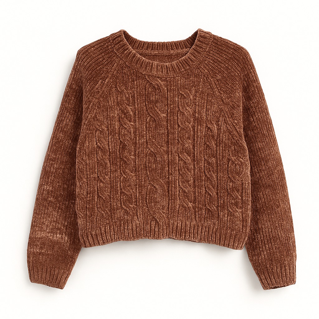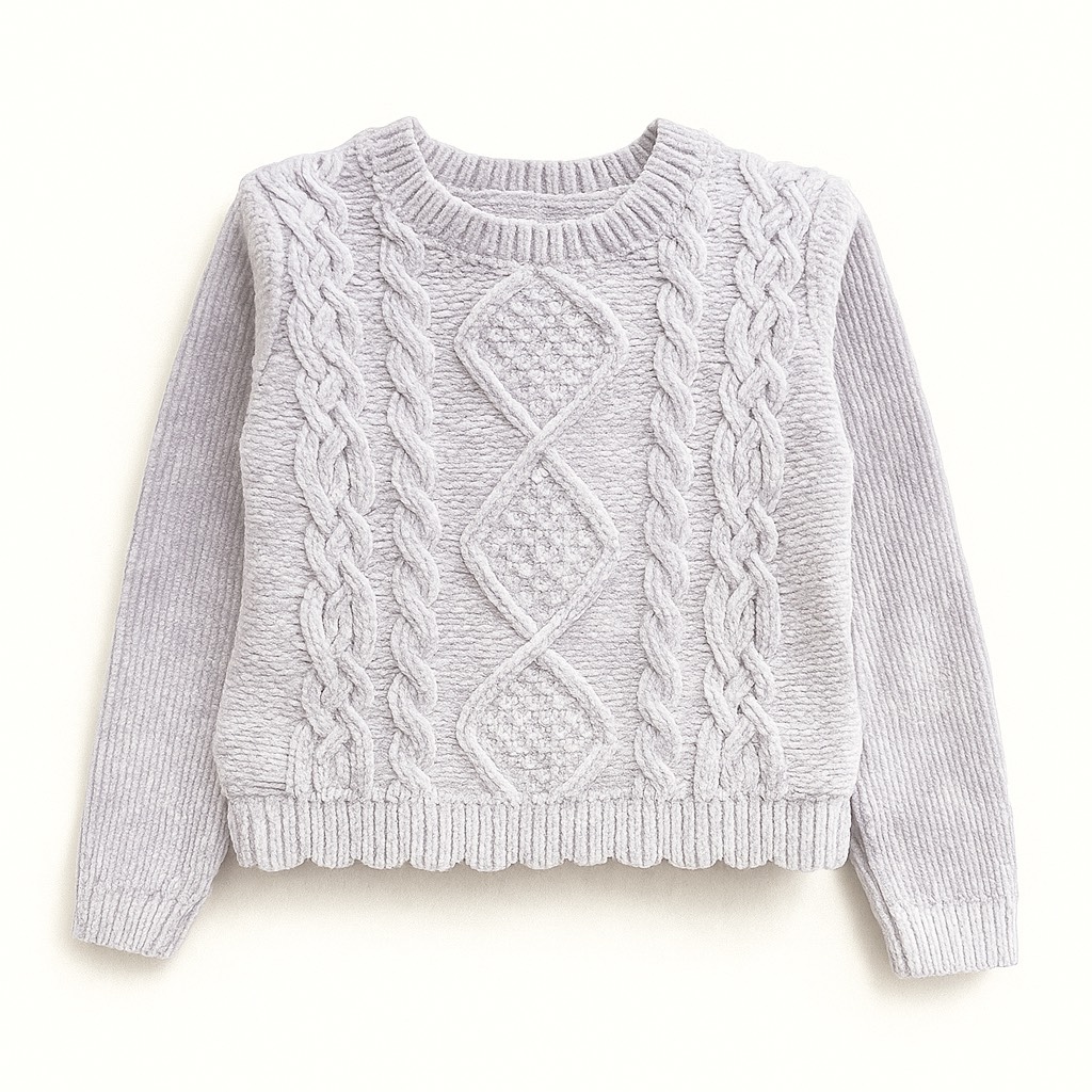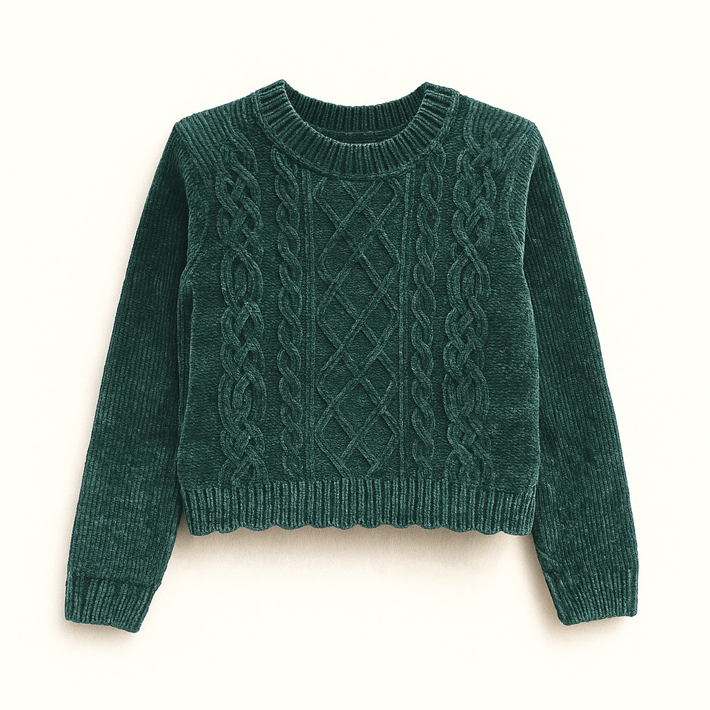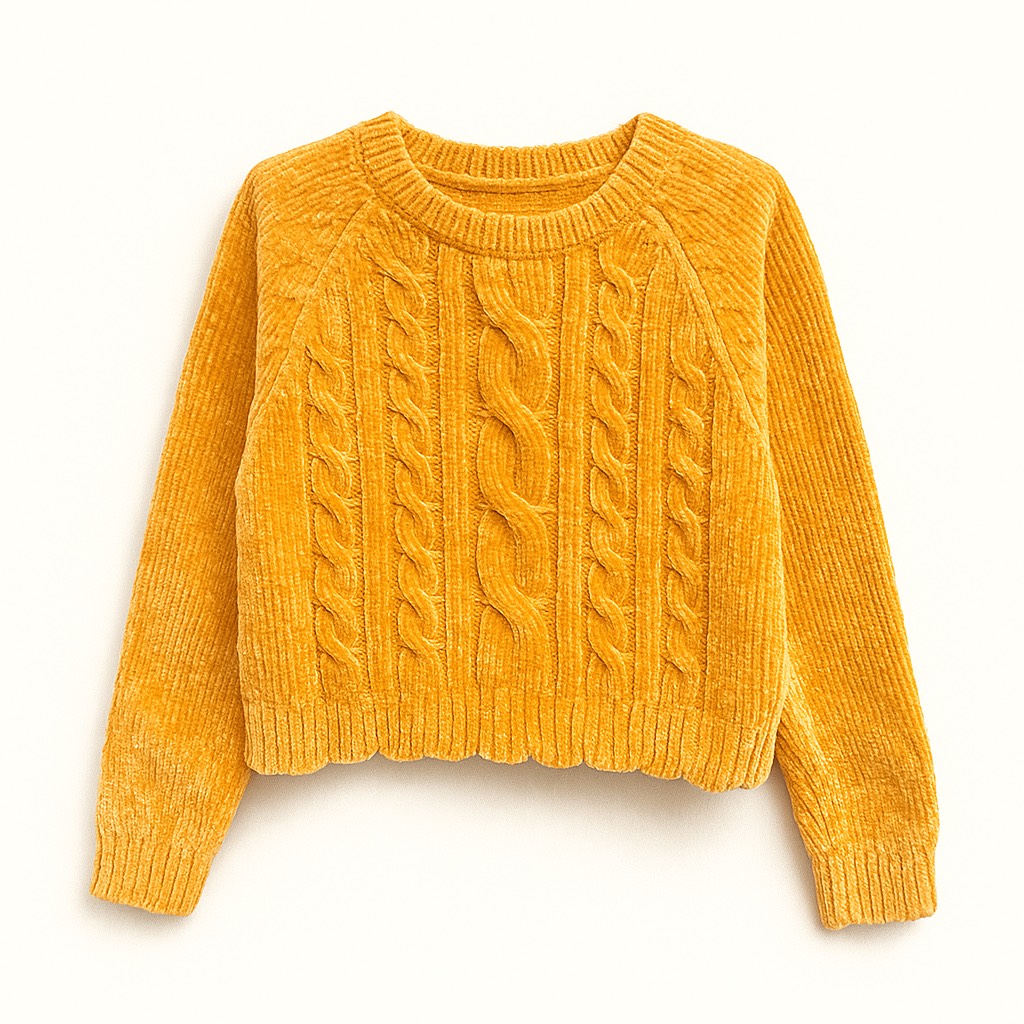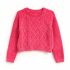 Crop top en maille douce avec motifs torsadés, coupe courte et finitions côtelées pour un style cosy et tendance.