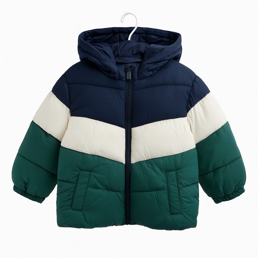 Doudoune chaude et légère avec capuche, design à bandes colorées et poches pratiques. Parfaite pour protéger du froid tout en assurant confort et style.