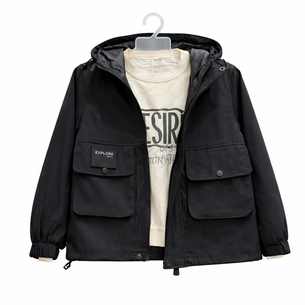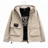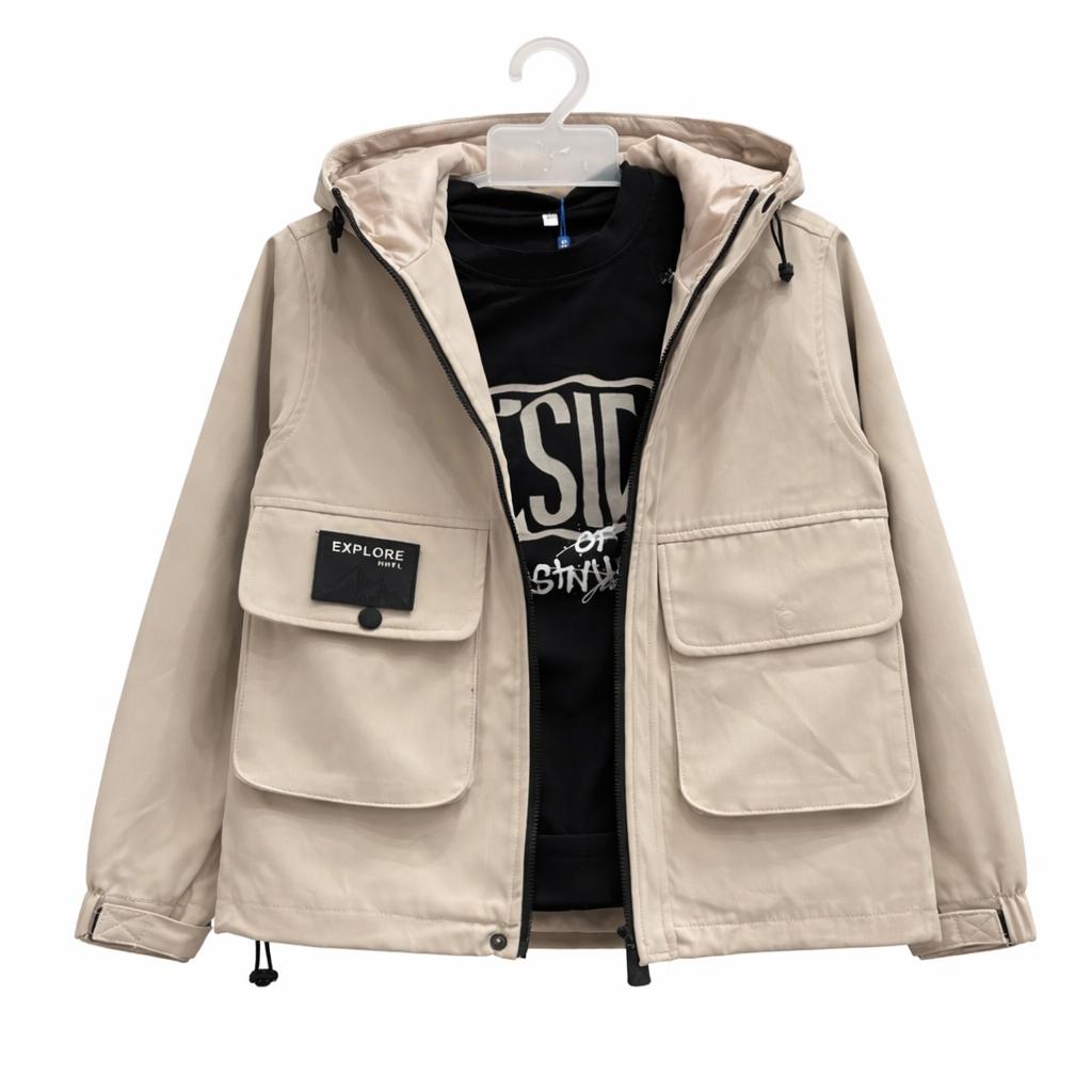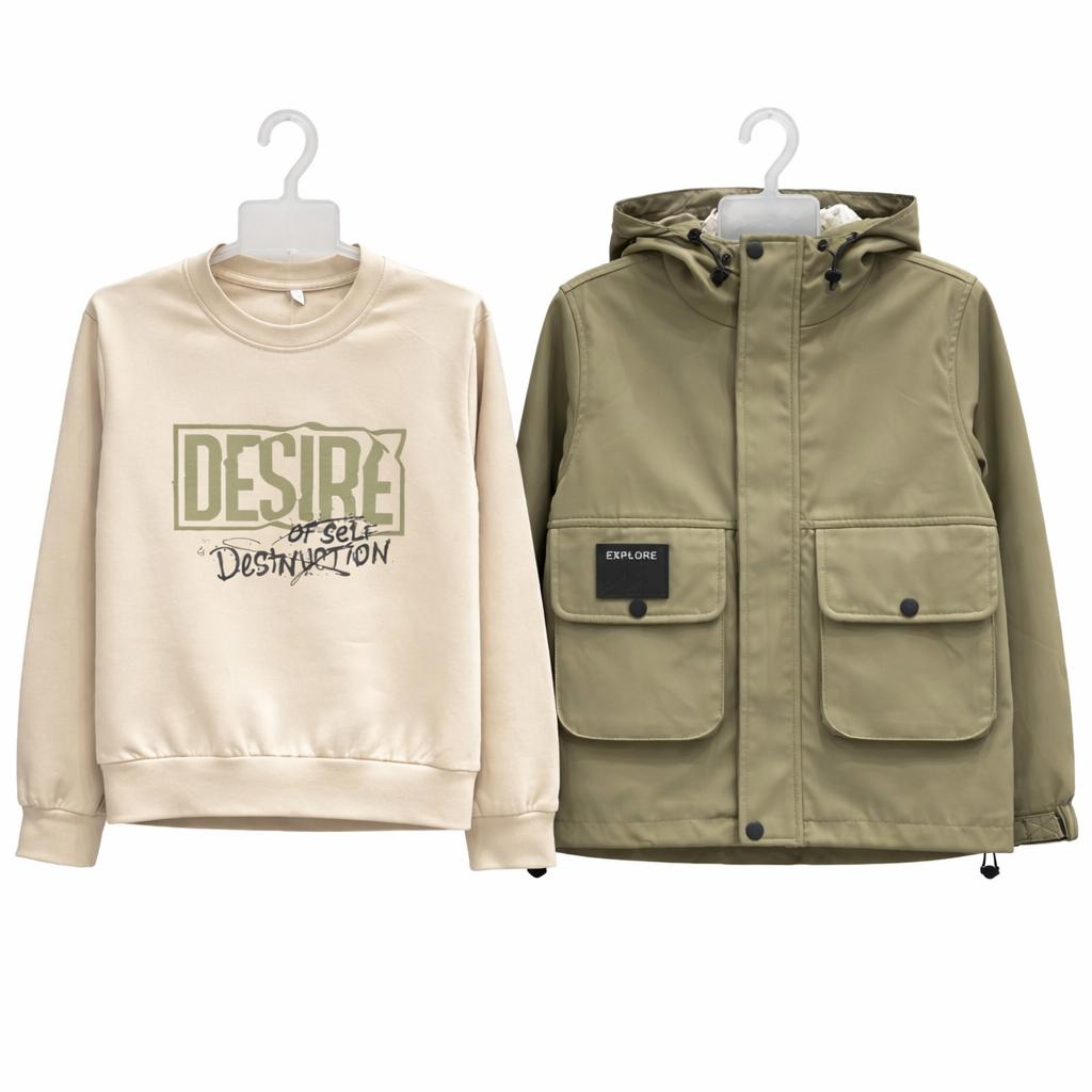 Look urbain et pratique : sweat écru doux avec imprimé graphique + veste kaki zippée à capuche, poches poitrine et bandes contrastées sur les manches. Parfait pour la mi-saison.