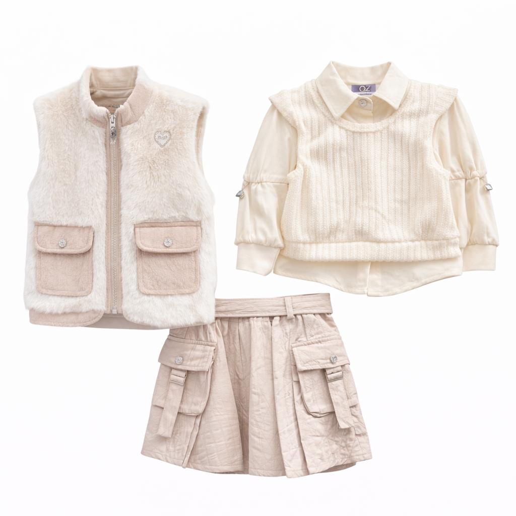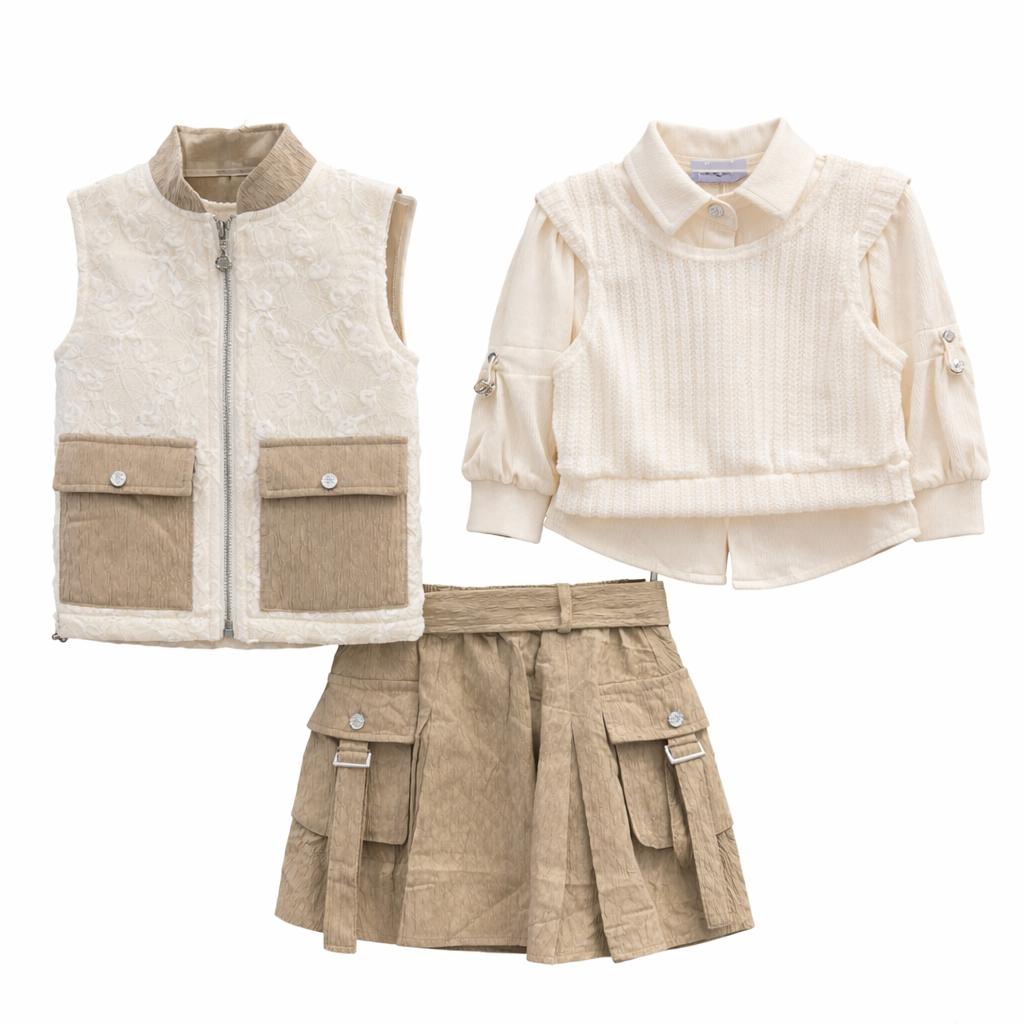 Look complet composé d’un gilet sans manches effet douceur avec poches, d’un haut à col avec pull sans manches texturé, et d’une jupe cargo à poches pratiques. Confortable et stylé, parfait pour une tenue chic au quotidien.