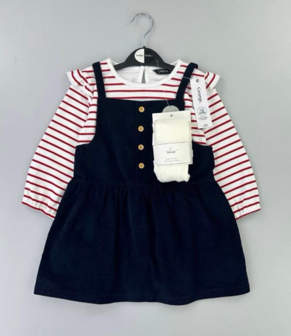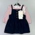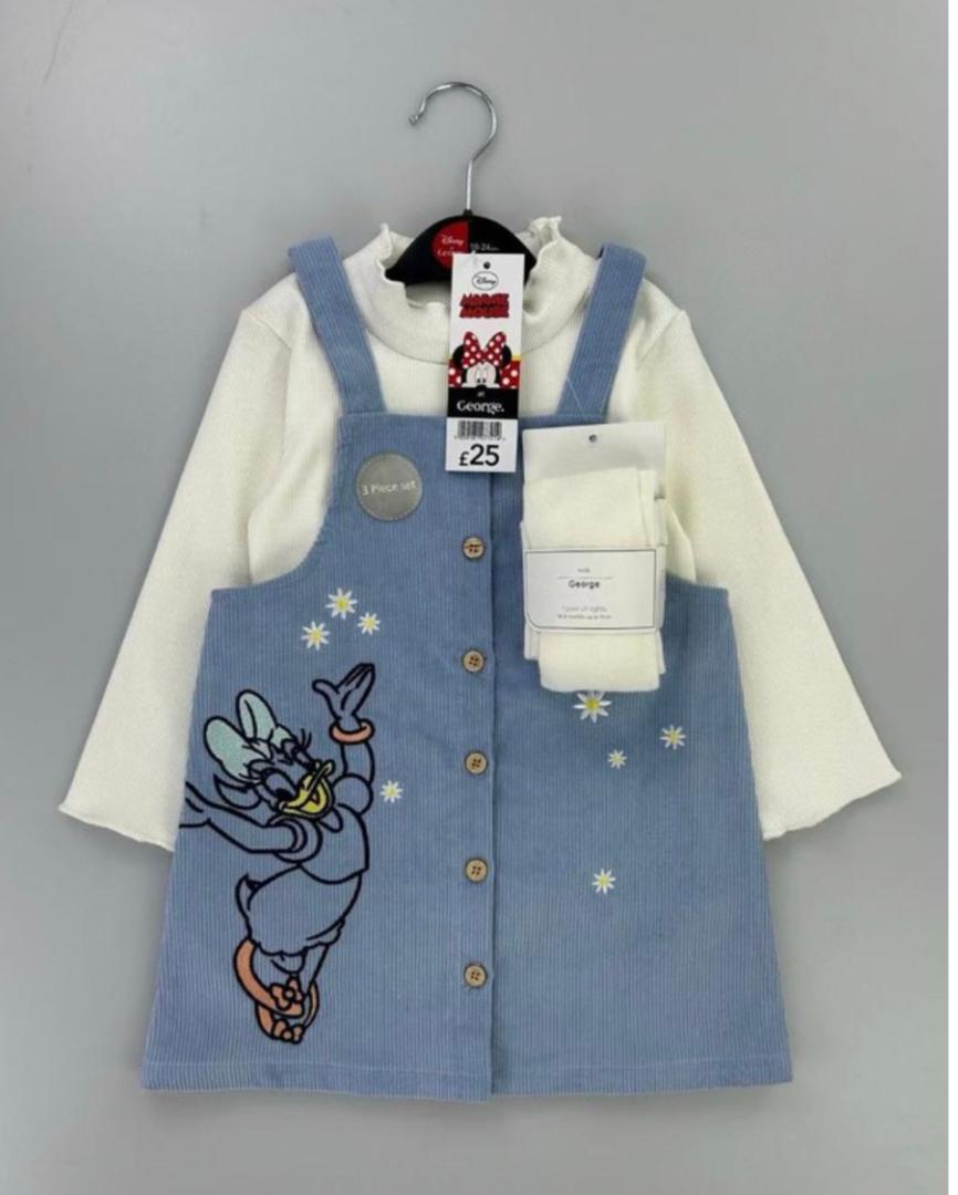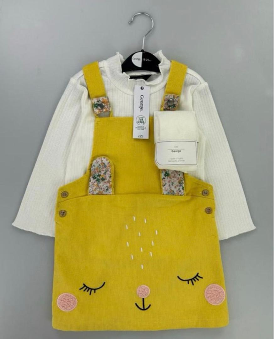 Adorable ensemble composé d’une robe salopette jaune avec motif visage brodé et détails fleuris aux bretelles, accompagnée d’un sous-pull blanc à col volanté et des collant. Un modèle doux et lumineux, parfait pour le printemps et les sorties quotidiennes. Confortable, pratique et plein de charme.