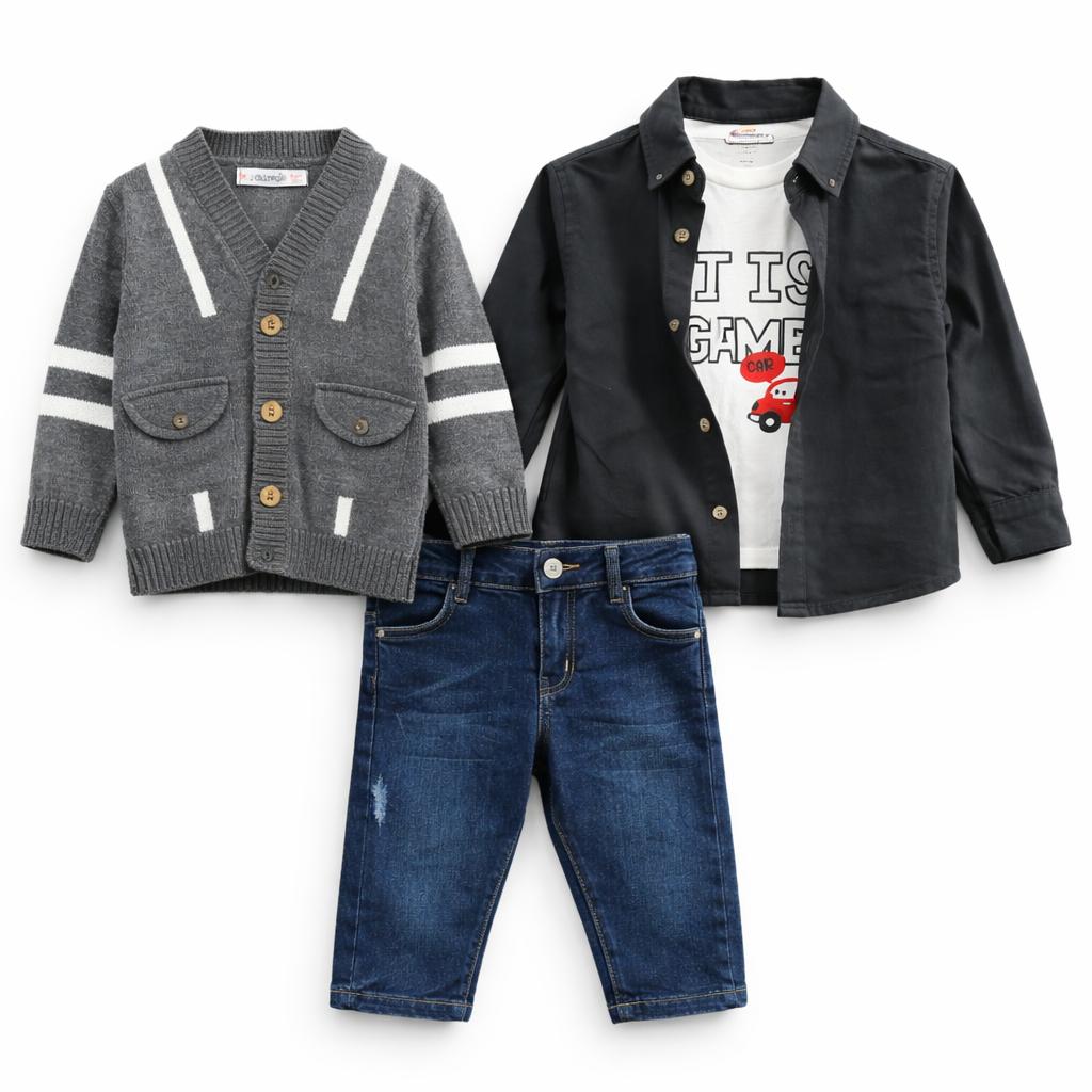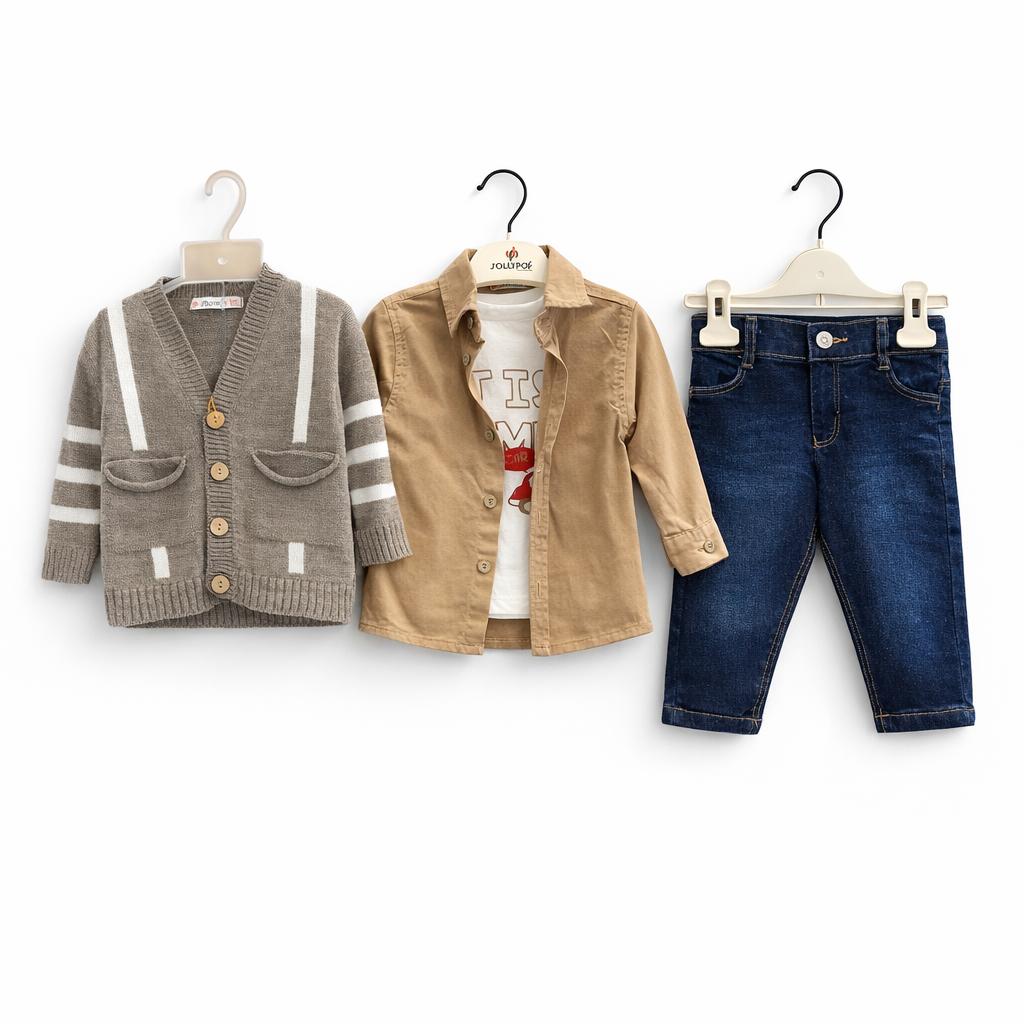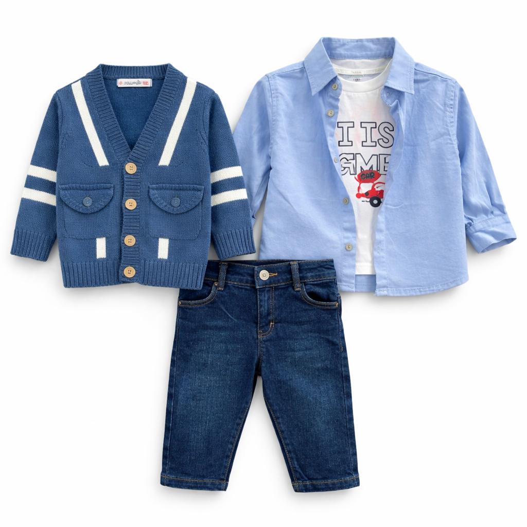 Idéal pour les sorties, fêtes familiales, anniversaires ou occasions spéciales, cet ensemble allie style casual chic et confort optimal pour bébé. Le jean en denim assure une tenue moderne et résistante, tandis que le t-shirt doux en coton garantit un contact agréable sur la peau. La chemise apporte une touche élégante, et le cardigan en maille complète parfaitement le look avec une finition raffinée.