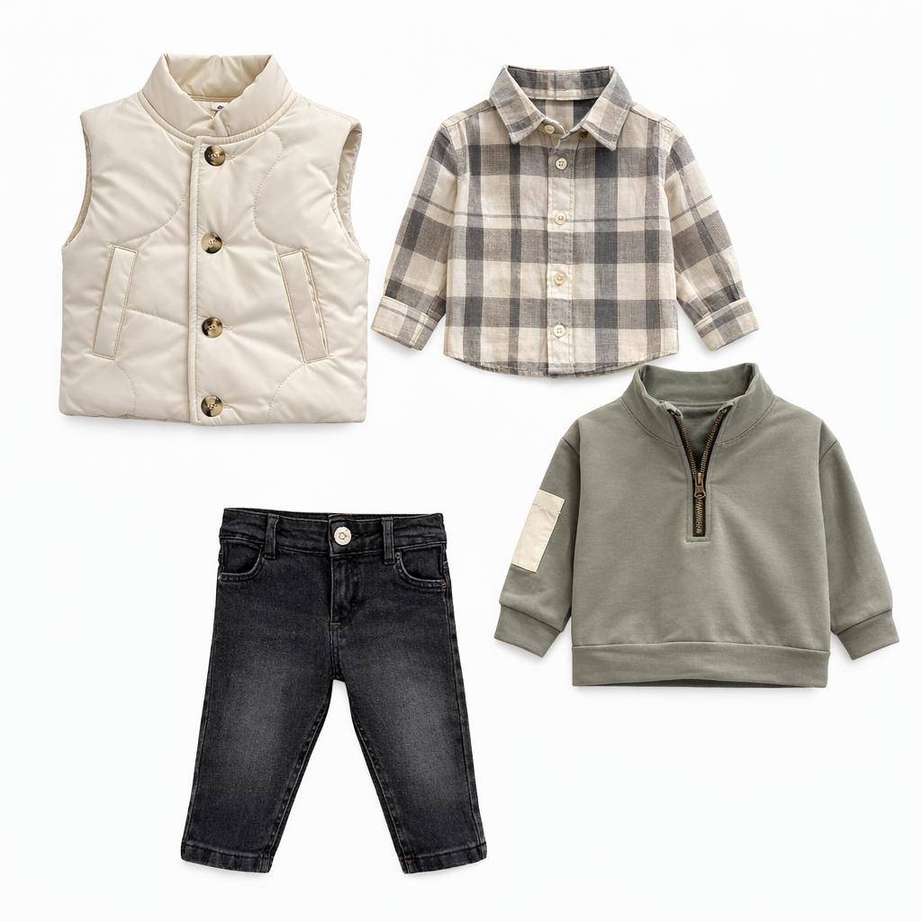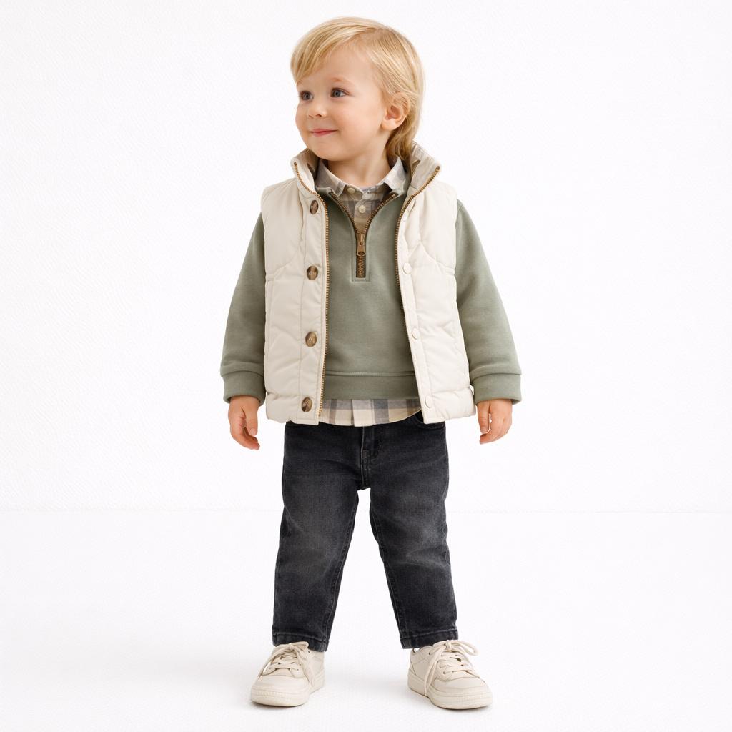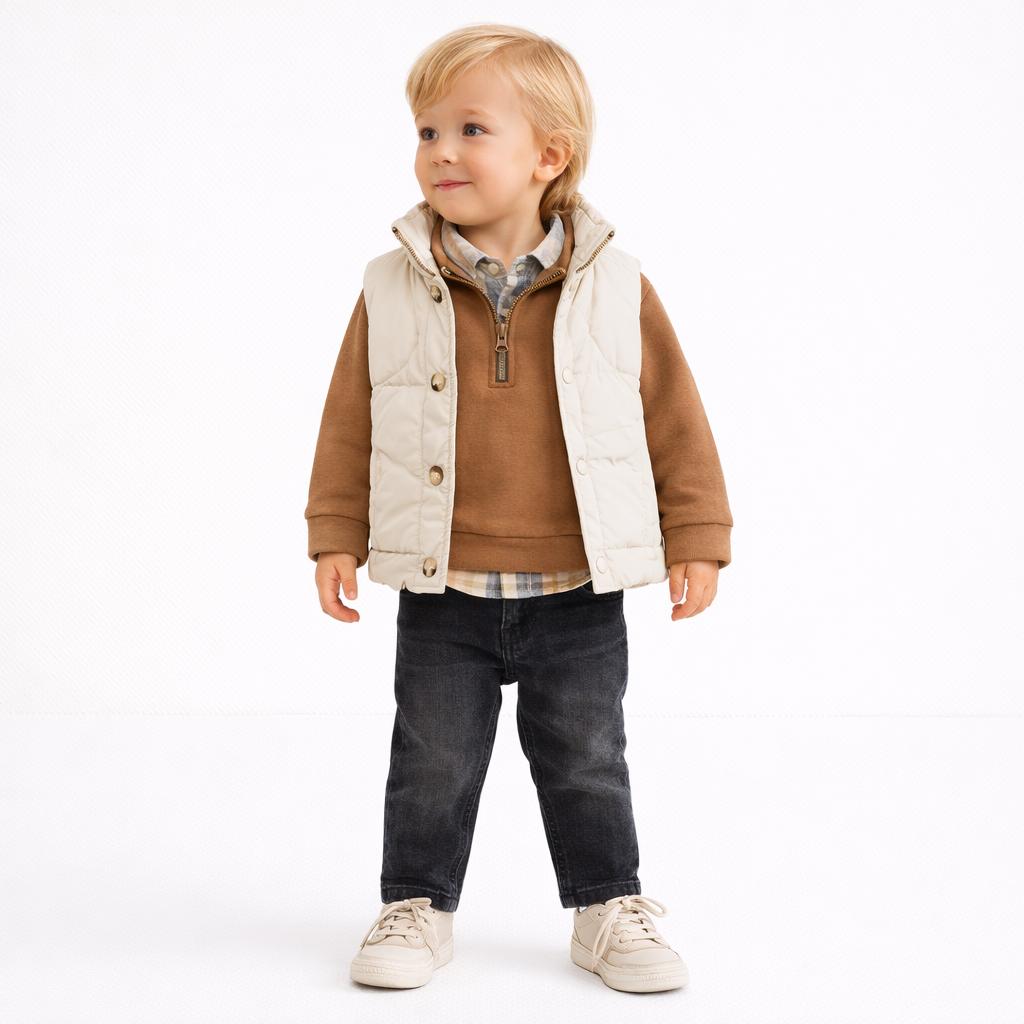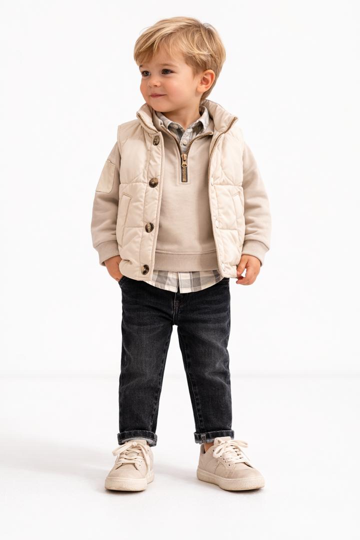 Ensemble chic et confortable composé d’une doudoune sans manches beige, d’un pull camel à col zippé, d’une chemise à carreaux et d’un jean denim foncé. Un look raffiné et moderne, parfait pour les sorties et occasions spéciales. Doux, chaud et facile à porter au quotidien