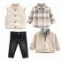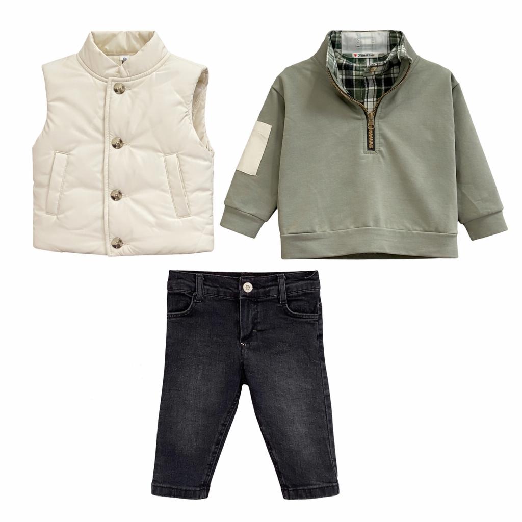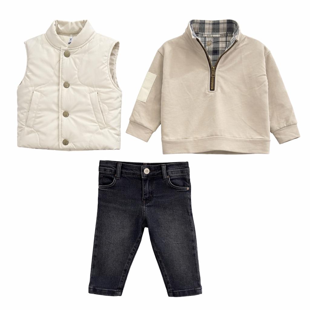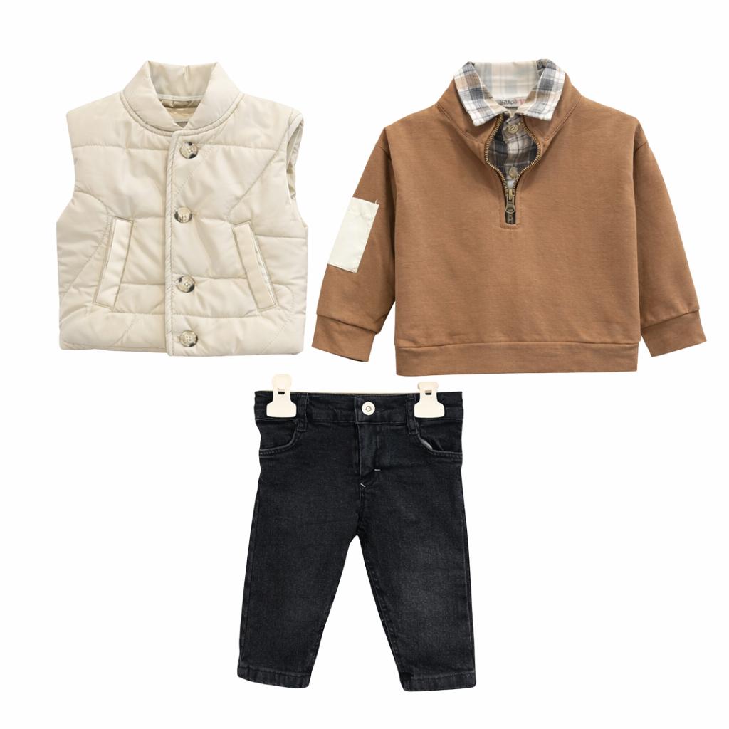 Ensemble chic et confortable composé d’une doudoune sans manches beige, d’un pull camel à col zippé, d’une chemise à carreaux et d’un jean denim foncé. Un look raffiné et moderne, parfait pour les sorties et occasions spéciales. Doux, chaud et facile à porter au quotidien