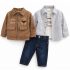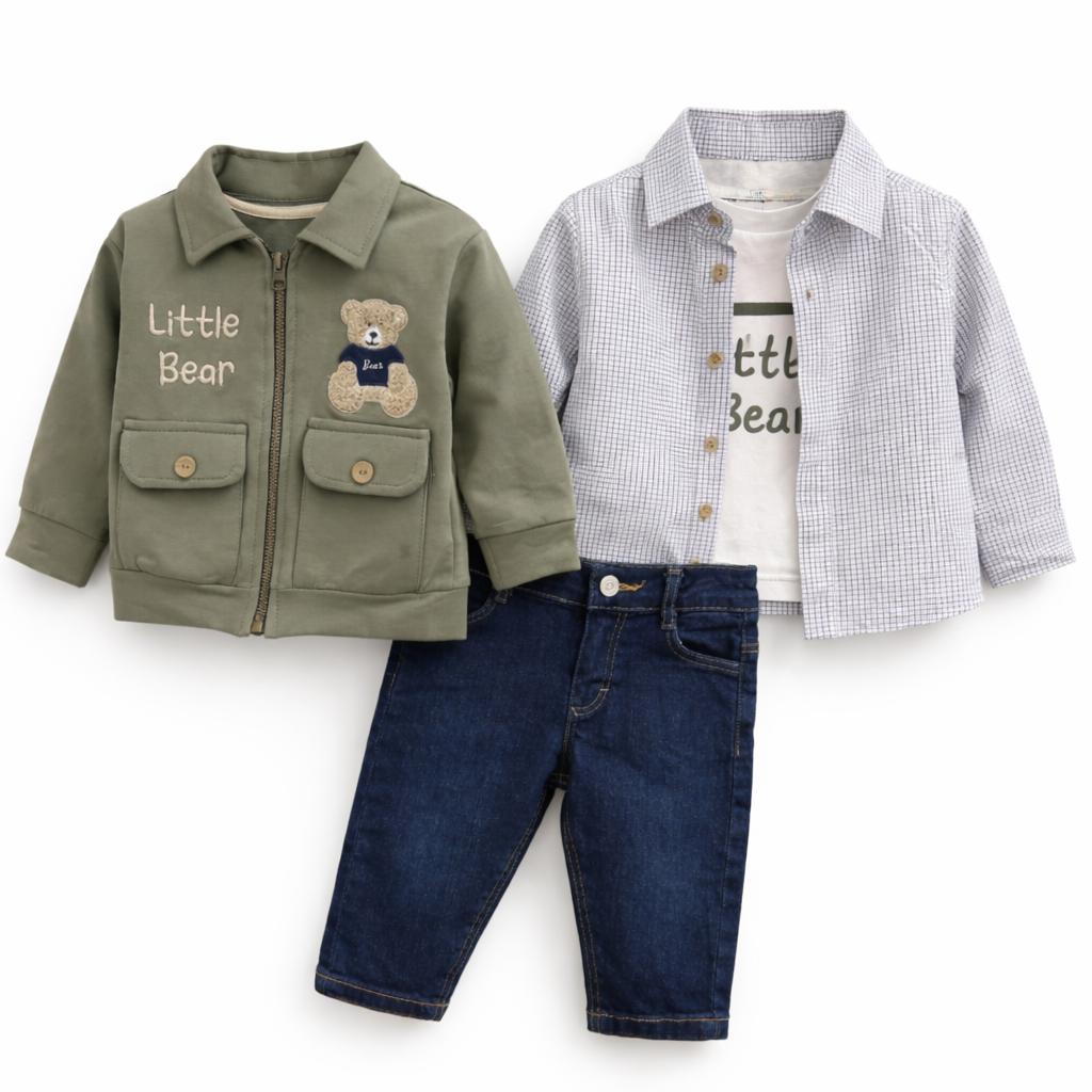 🧸 Ensemble Bébé Garçon 4PCS Little Bear – Veste Zippée + Chemise Carreaux + Pull + Jean Denim Chic