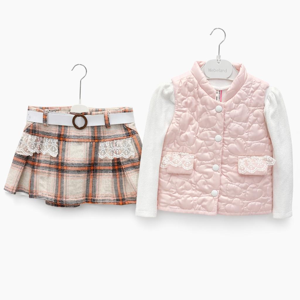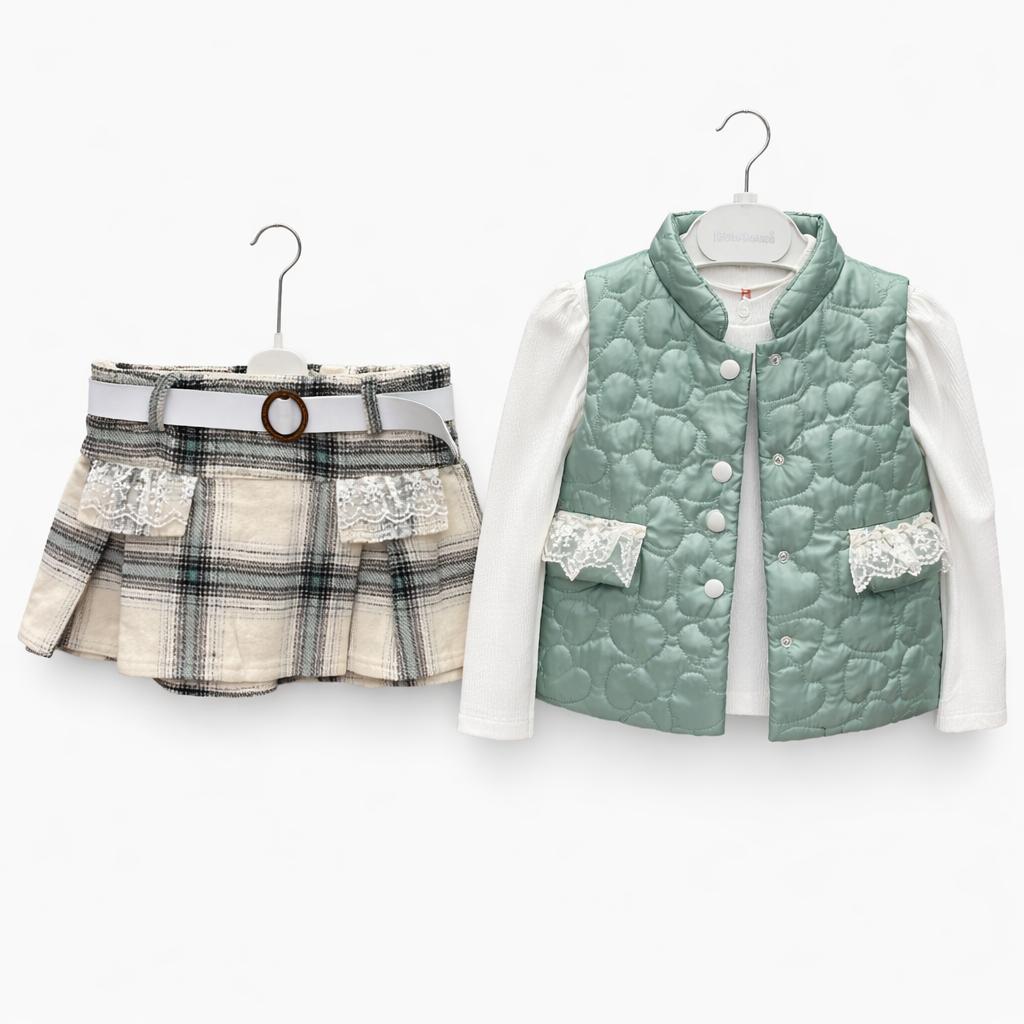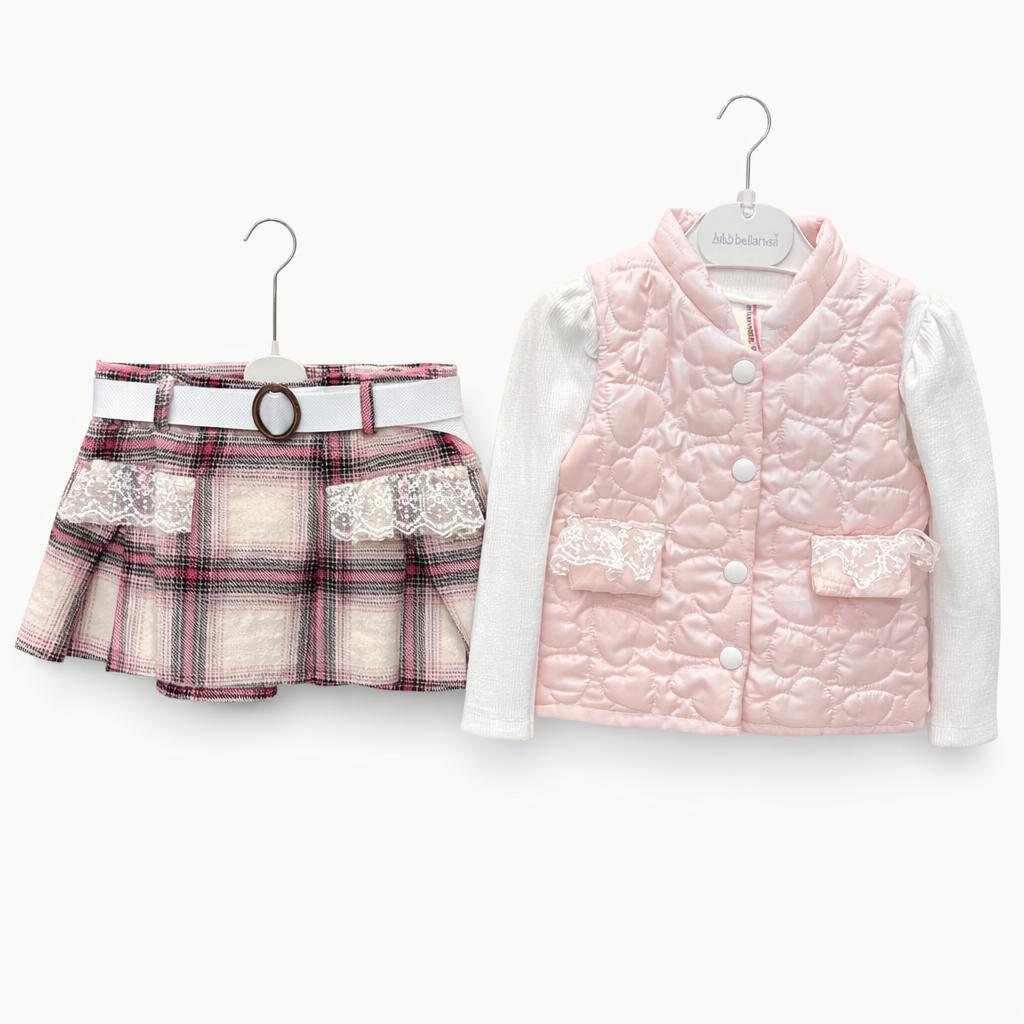 Ensemble Fille H&B Bellarose 3 Pièces – Jupe Carreaux, Pull Blanc & Gilet Matelass