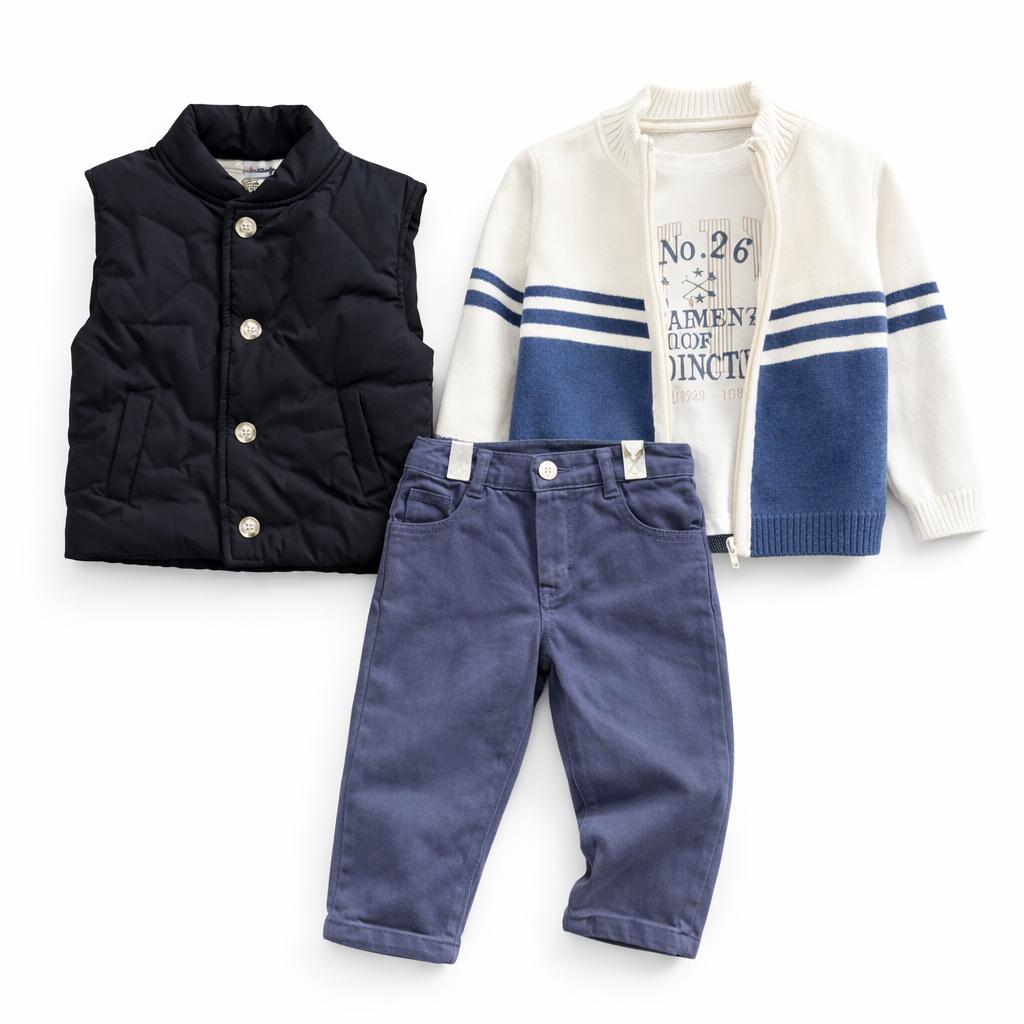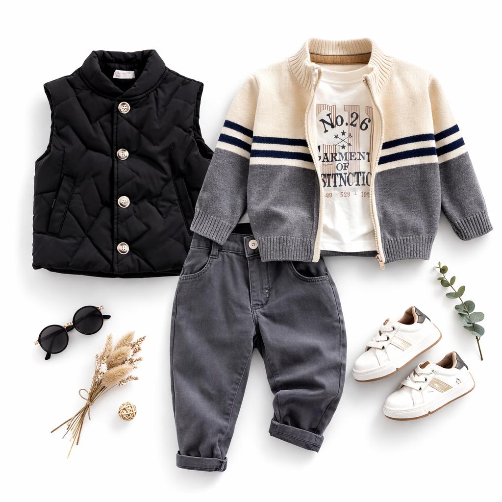 Ensemble Garçon 4 Pièces – Jean, Gilet Zippé, T-Shirt Graphique, Doudoune Sans Manche