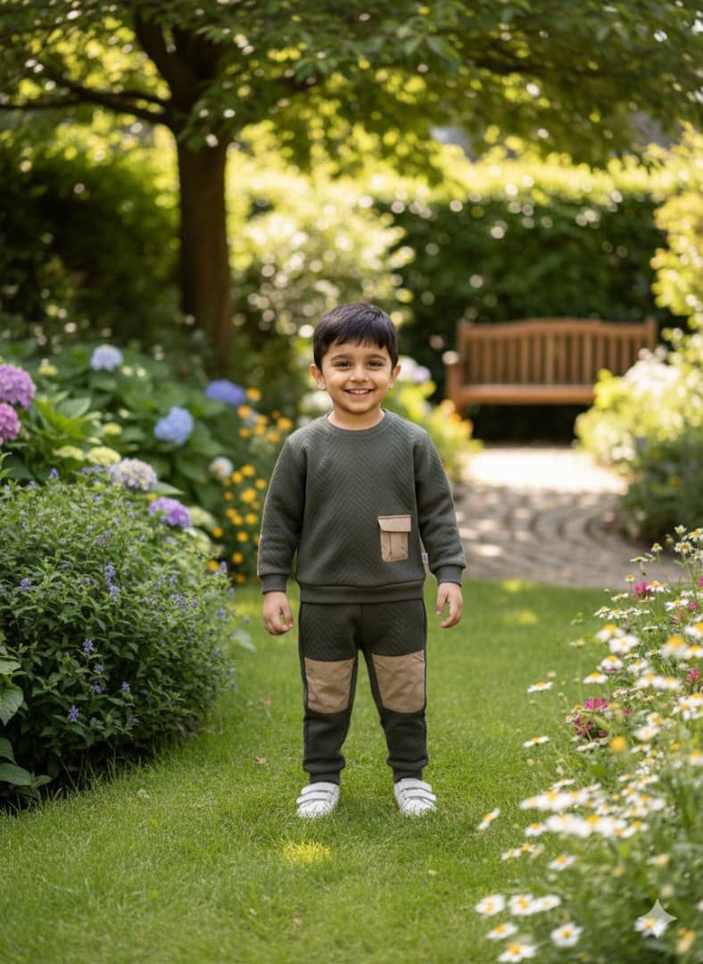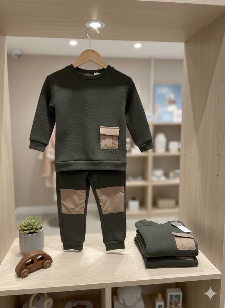 Ensemble confortable en tissu matelassé, composé d’un haut manches longues et d’un pantalon assorti. Détails de poches contrastées beige pour un look moderne et tendance. Idéal pour l’école et les sorties du quotidien