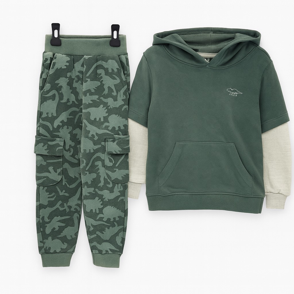 Tenue confortable avec sweat à capuche et pantalon cargo à motif dinosaures, pratique et tendance pour un look décontracté au quotidien.