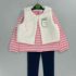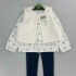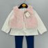 Adorable ensemble 3 pièces pour bébé fille comprenant un haut blanc à manches longues avec motif floral délicat, un gilet sans manches en fausse fourrure douce et un legging effet jean bleu foncé. Confortable et élégant, parfait pour un look chic au quotidien.