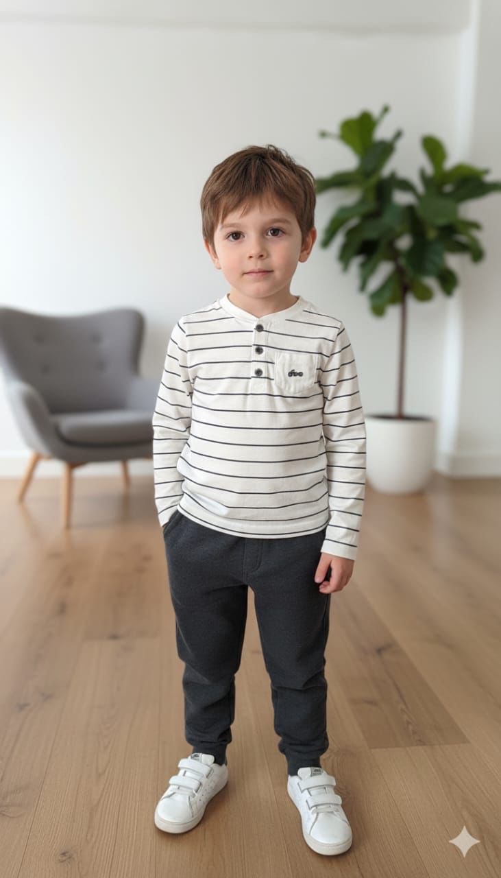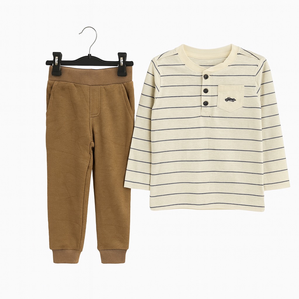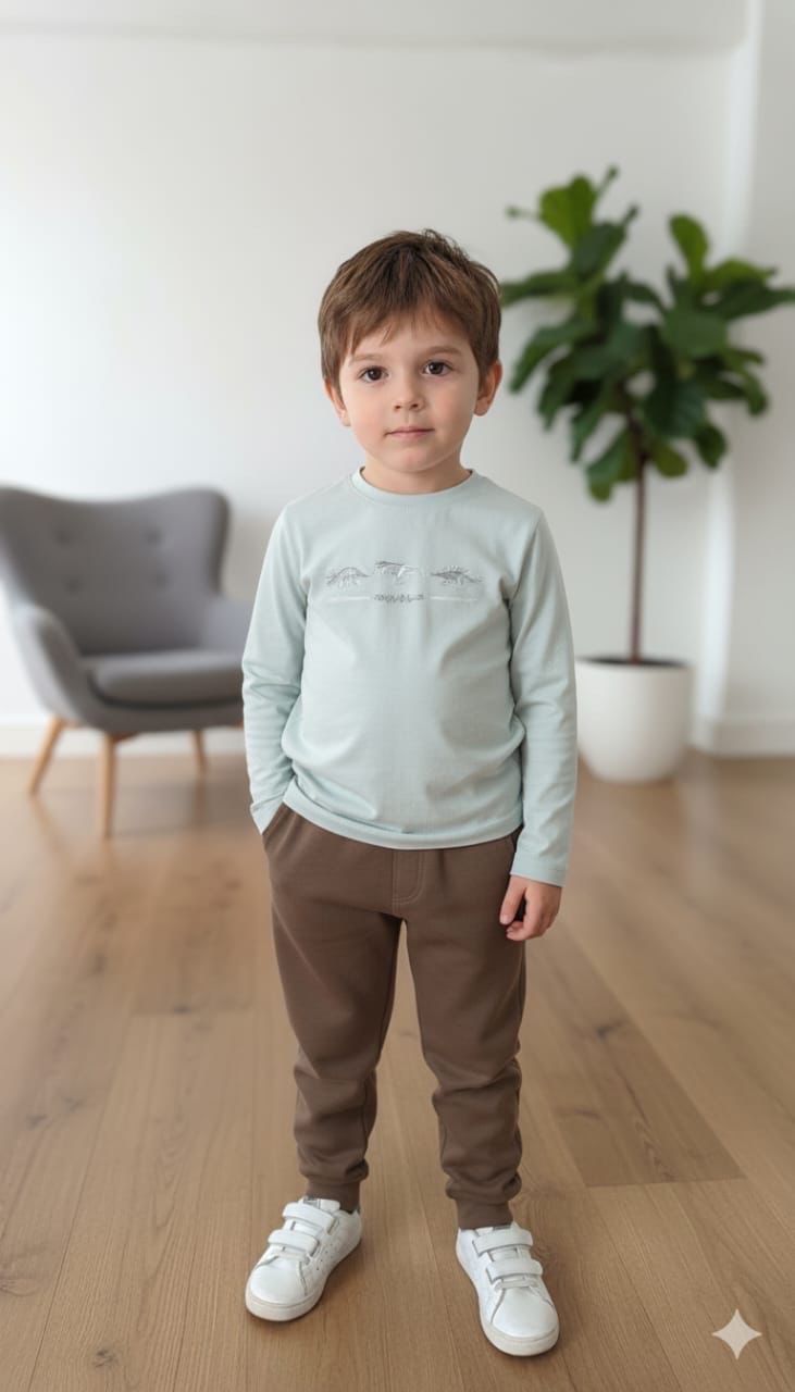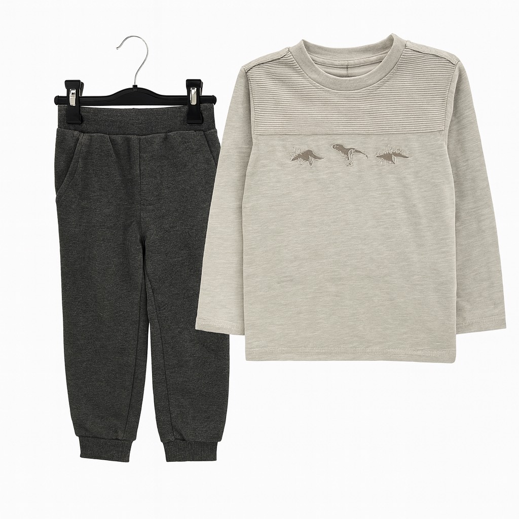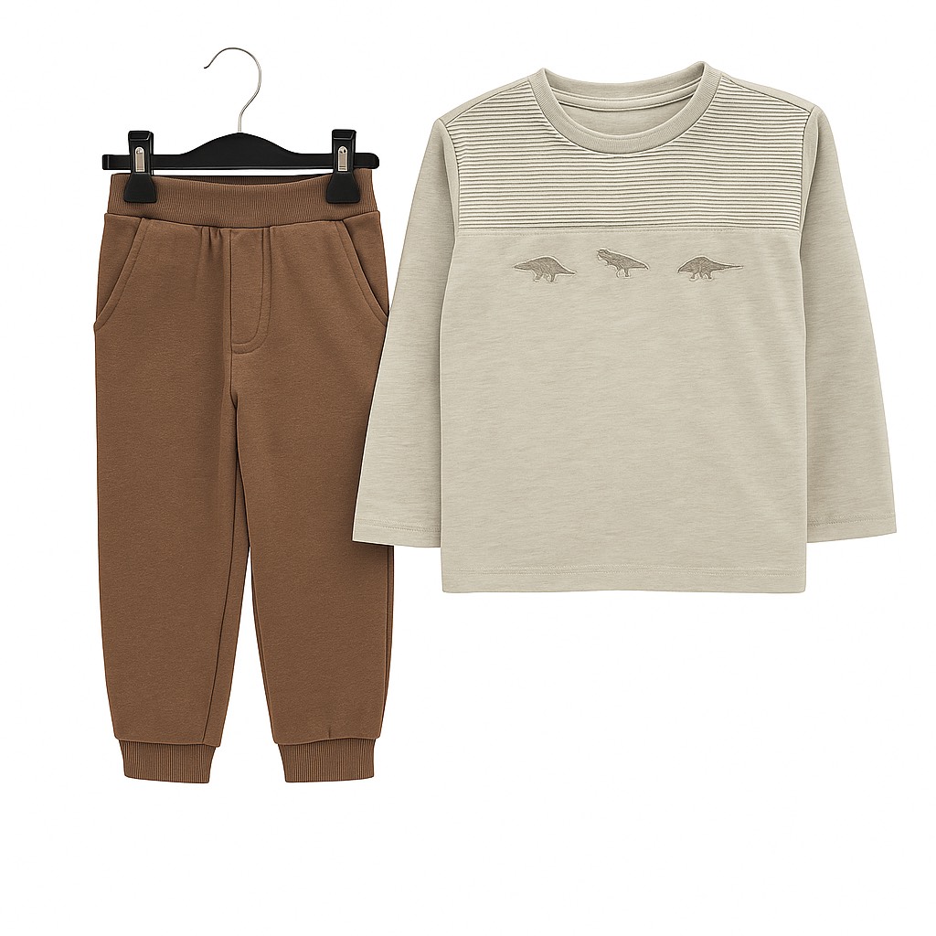 Un ensemble confortable composé d’un haut à manches longues avec détails à rayures et petits dinosaures brodés, associé à un pantalon doux avec poches. Parfait pour un look pratique et tendance au quotidien.