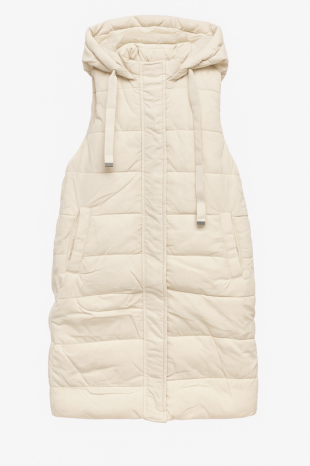 Gilet long matelassé avec capuche et poches latérales, fermeture zippée sous patte et coupe confortable. Une pièce légère et pratique pour superposer tout en restant au chaud.