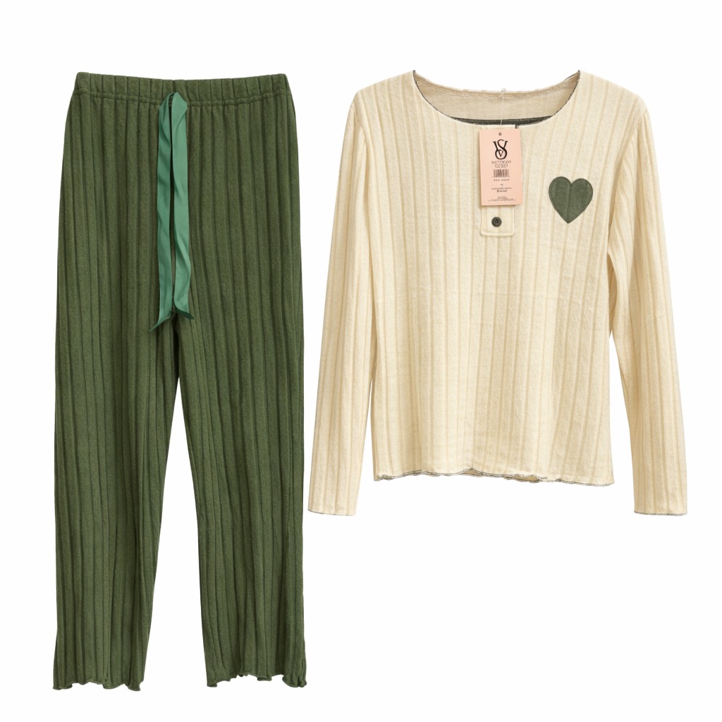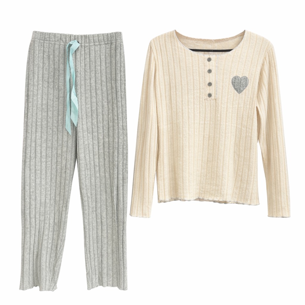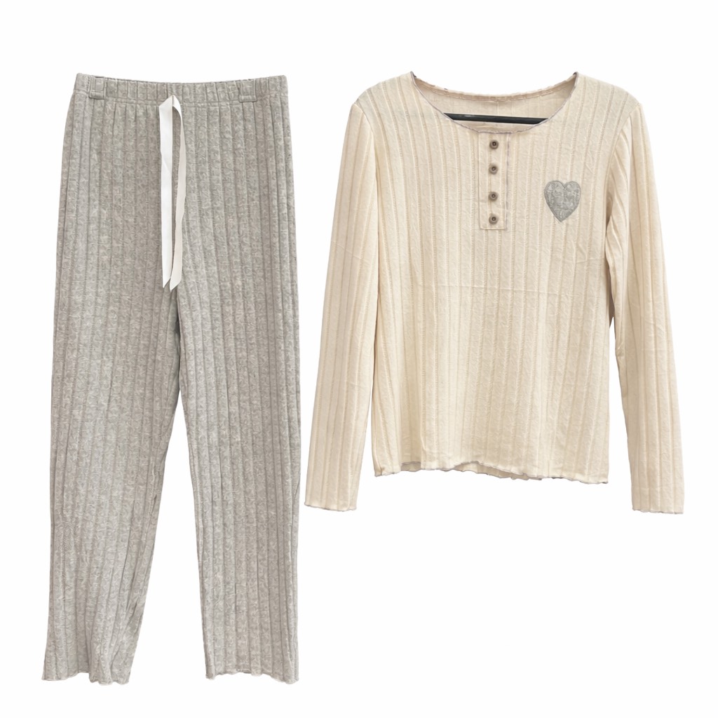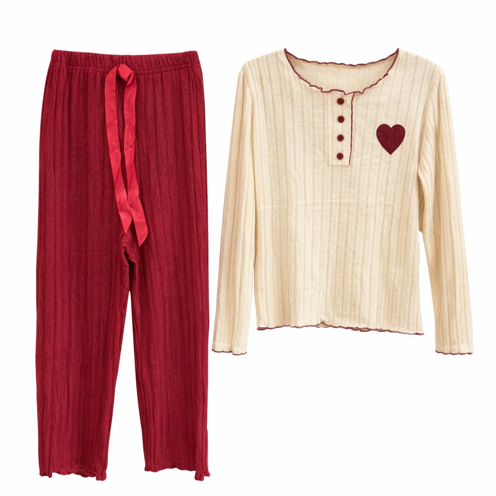 Ensemble pyjama deux pièces en maille côtelée, composé d’un haut manches longues crème avec encolure boutonnée, fin liseré contrasté et motif cœur brodé, accompagné d’un pantalon bordeaux à taille élastique avec lien. Doux, chaleureux et plein de charme pour des nuits confortables.