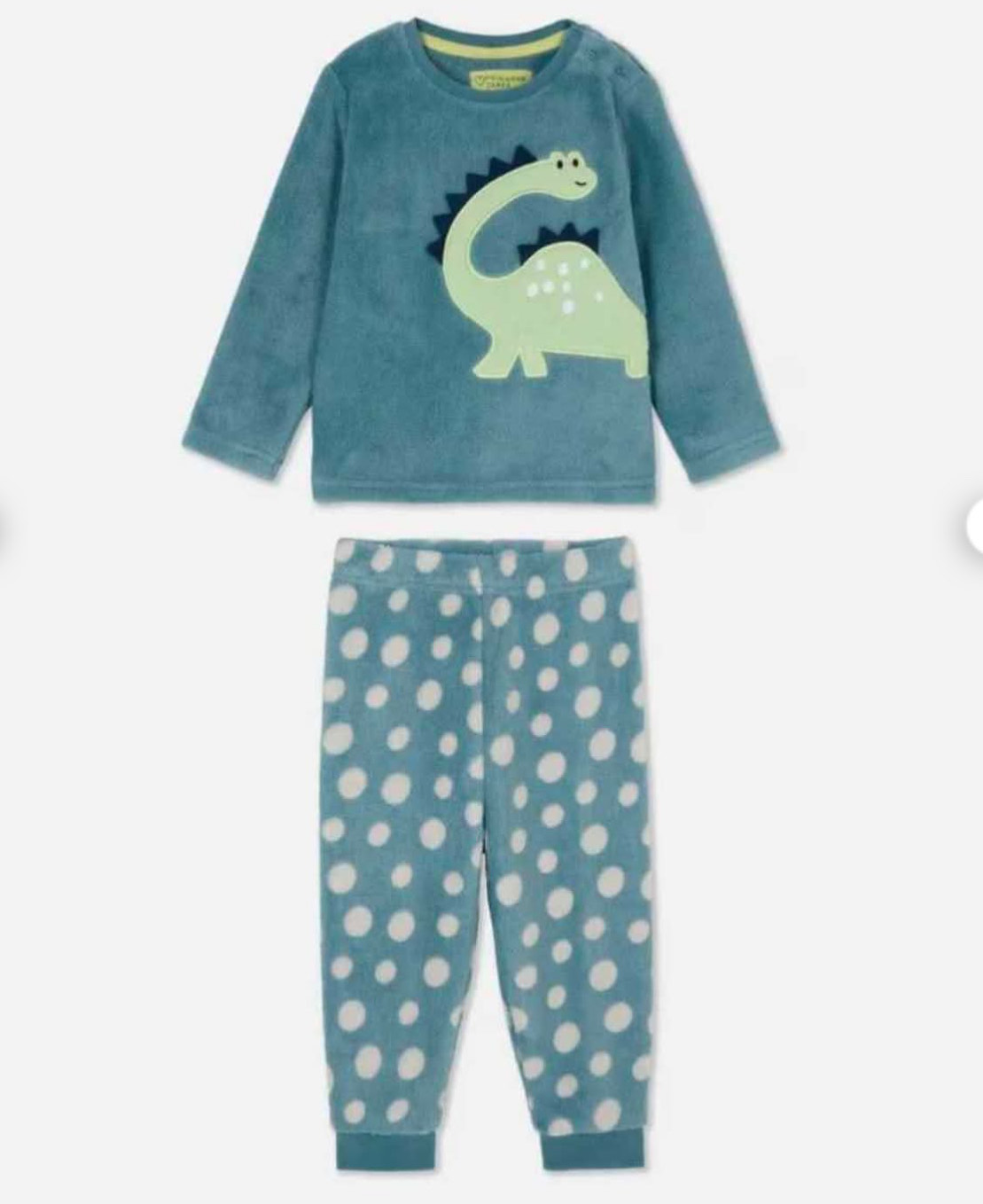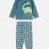 Pyjama deux pièces en tissu doux et confortable, composé d’un haut à manches longues avec motif dinosaure et d’un pantalon assorti à pois. Idéal pour des nuits cosy et pleines de douceur.
