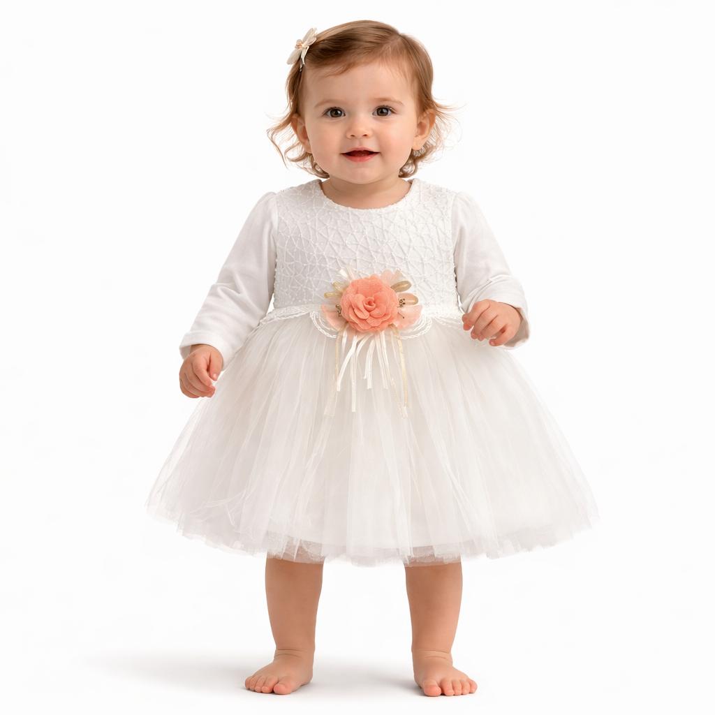 Magnifique robe de cérémonie pour bébé fille avec haut blanc texturé à manches longues et jupe en tulle rose poudré délicatement volumineuse. Sublimée par une fleur décorative à la taille et des détails en dentelle, elle est parfaite pour les fêtes, anniversaires et occasions spéciales. Élégante, douce et pleine de charme