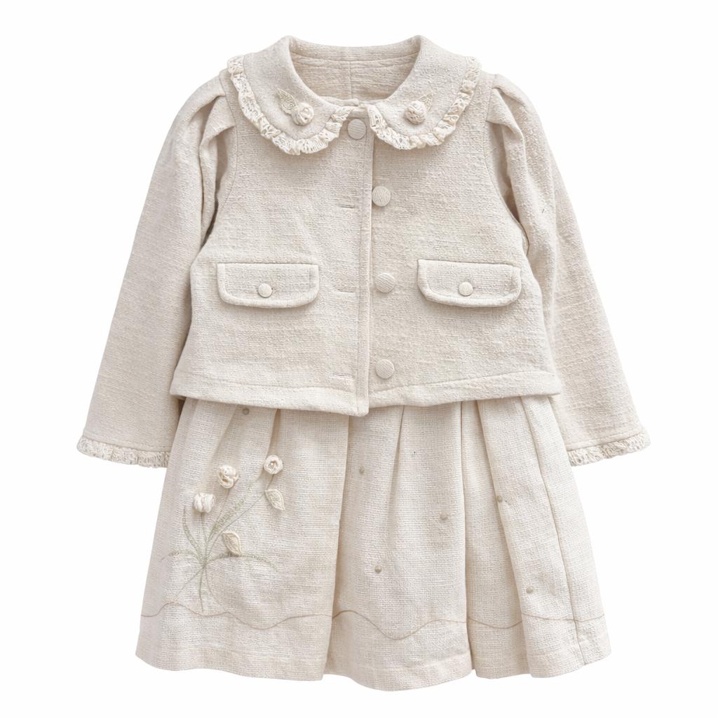 Adorable ensemble composé d’une robe écrue ornée de broderies florales délicates et d’une veste assortie à col festonné. Élégant et intemporel, parfait pour les cérémonies, occasions spéciales. Confortable et raffiné.