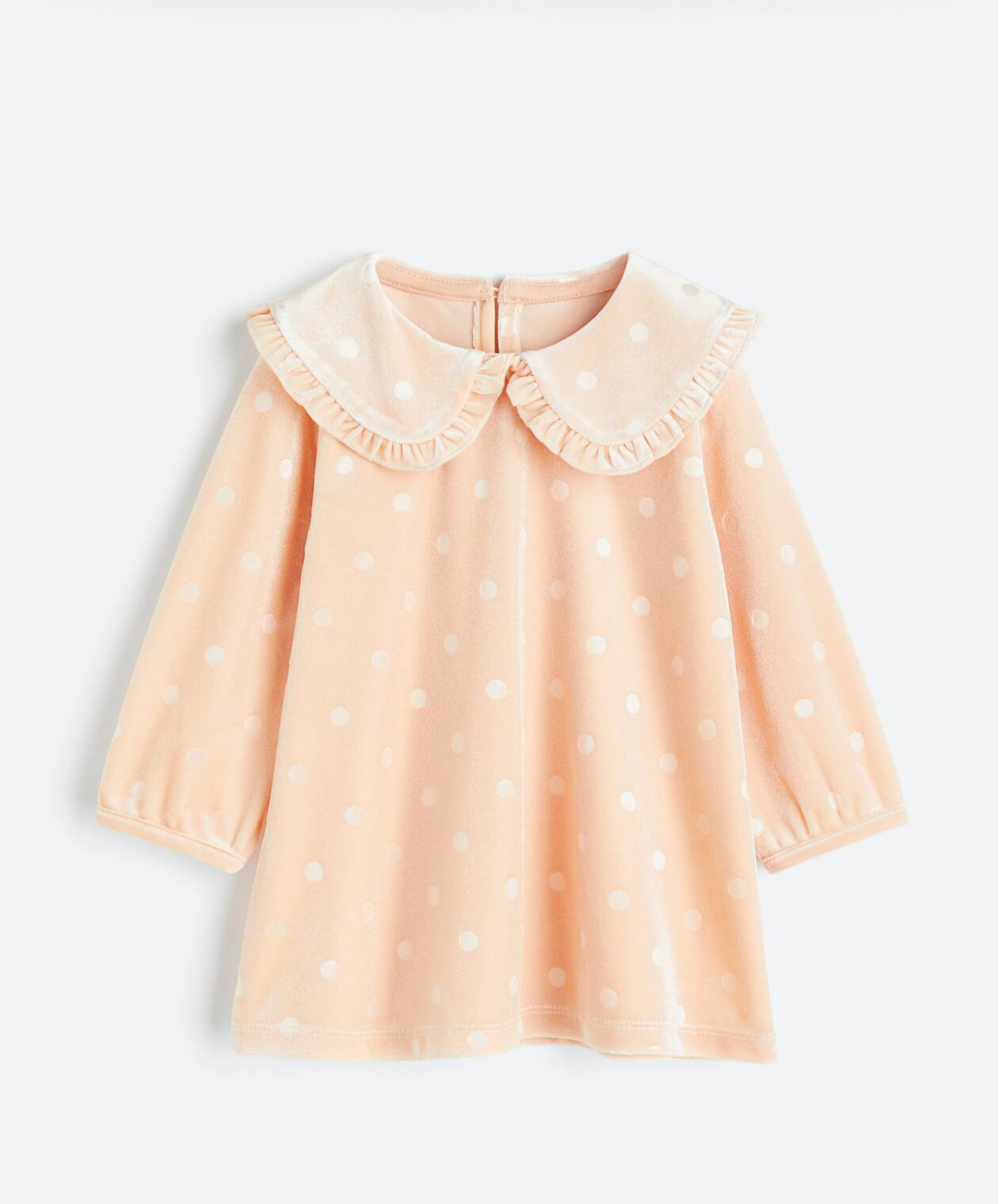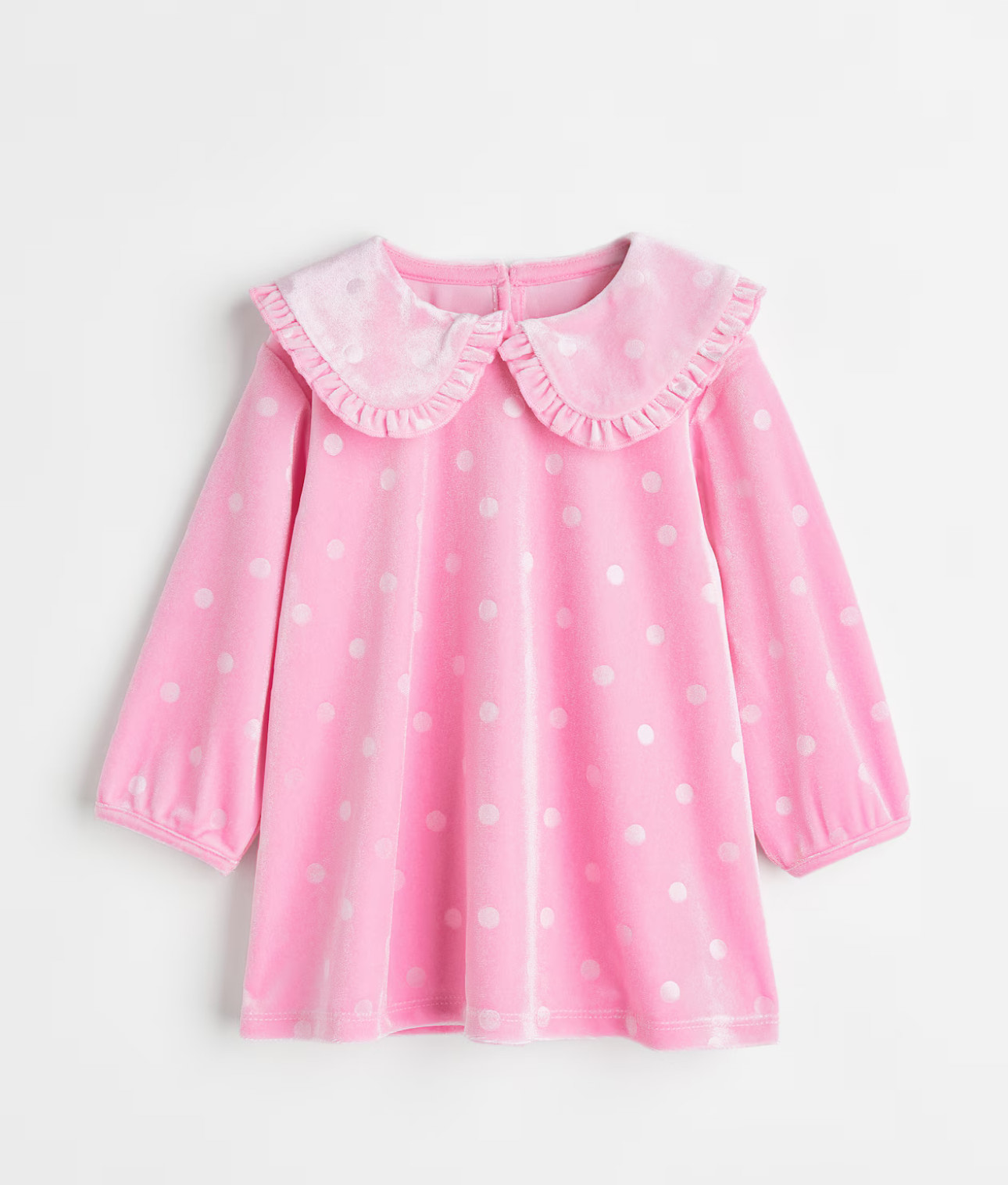 Robe en velours doux ornée de pois, avec col volanté et manches longues. Confortable et élégante, parfaite pour un look chic et adorable au quotidien.